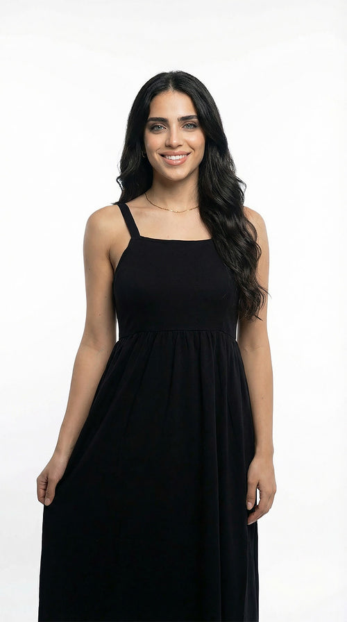فستان فسكوز طبيعي بأستك من الوسط و جيوب أسود