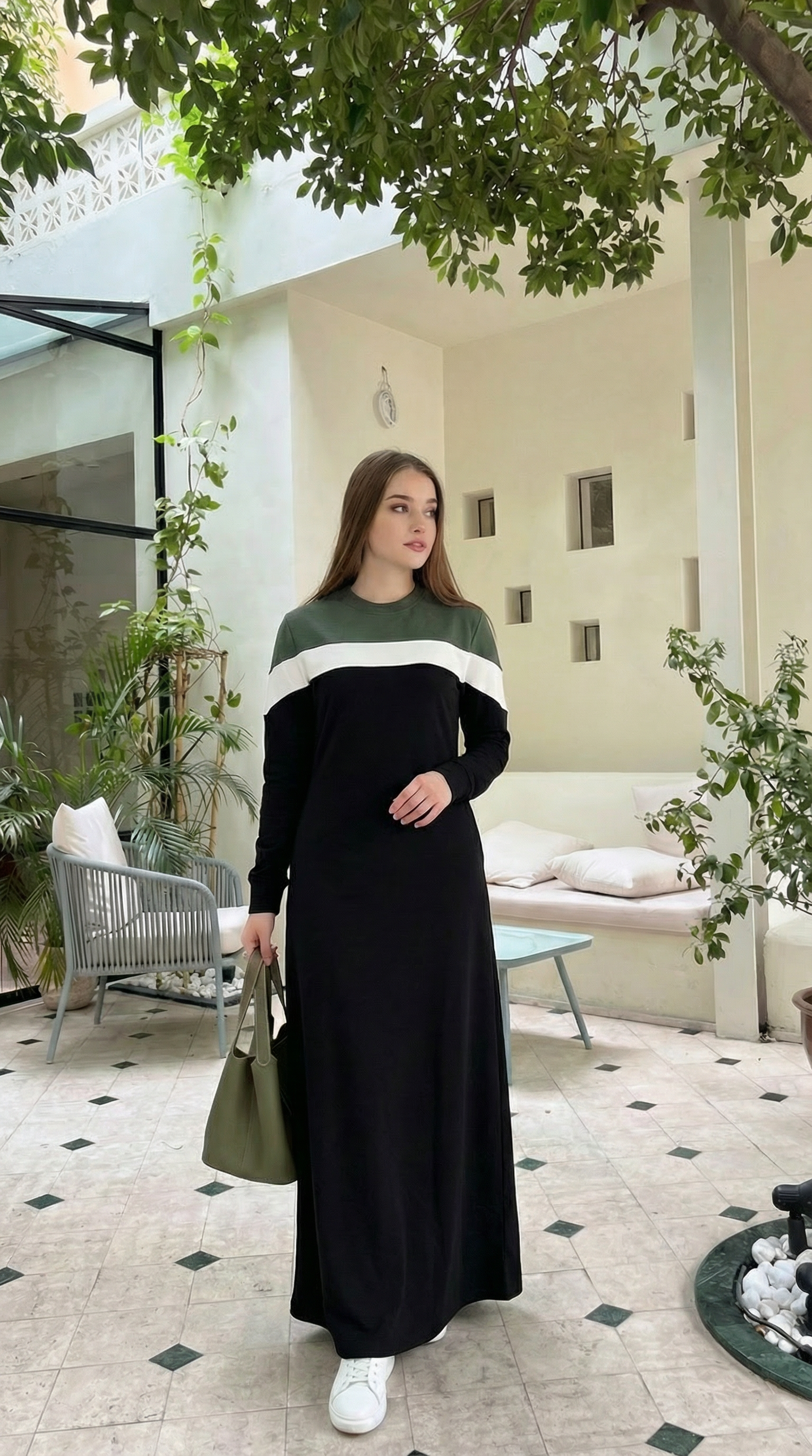 Abaya sport crêpe de couleur olive et nopir en coton